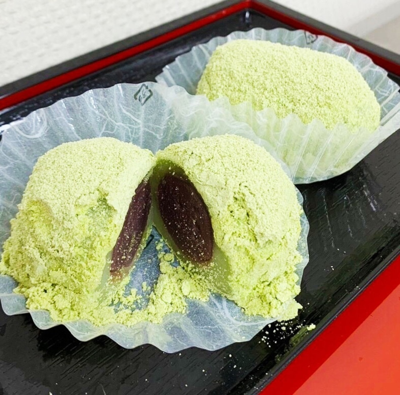 ②餅にまんべんなくきなこがついています。当店のあんこは甘さ控えめですので、きなこの風味も味も感じやすいですよ!