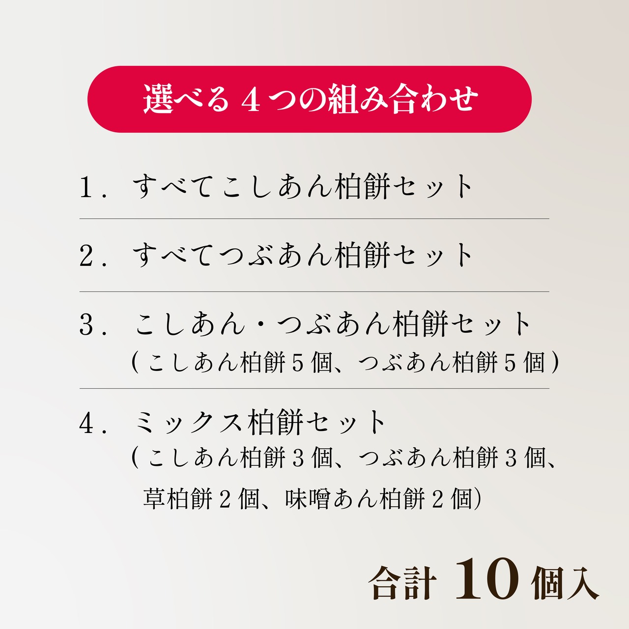 *選べる組み合わせ! ※柏の葉は取ってお召し上がりください。 ーーーーーーーーーーーーー 1、全てこしあん柏餅セット 2、全てつぶあん柏餅セット 3、こしあん&つぶあん柏餅セット (こしあん5個、つぶあん5個) 4、ミックス柏餅セット (こしあん3個、つぶあん3個、草柏餅2個、味噌あん2個) ーーーーーーーーーーーーー ●内容量:10個(1個80g越え) ●原材料: つぶあん、こしあん…(上新粉、小豆、砂糖、水飴、寒天、塩/トレハロース、柏の葉) みそあん…(上新粉、生あん、砂糖、水飴、味噌/トレハロース、柏の葉) 草かしわ…(上新粉、よもぎ、小豆、砂糖、水飴、塩、柏の葉) ●アレルギー物質特定原材料(28品目):なし ●賞味期限について:解凍後2日までにお召し上がりください。 ●保存方法について:ご家庭の冷凍庫にて保存してください。(保存期限1ヶ月) ●配送方法について:クール便(ヤマト運輸) ●おいしいお召し上がり方:常温解凍してください。※季節によって解凍時間は異なります ●のし:可 ●包装:茶紙包装 ※商品を発送する際、お品物は箱に入れて発送致します。 -------------------------------------------------------------- △注意△ ・できるだけ早めの発送を心がけていますが、 日数がかかる場合もありますのでご了承ください。 ★質問等ございましたら、お気軽にお問い合わせください。